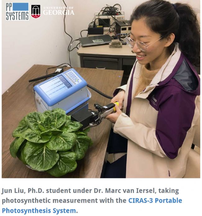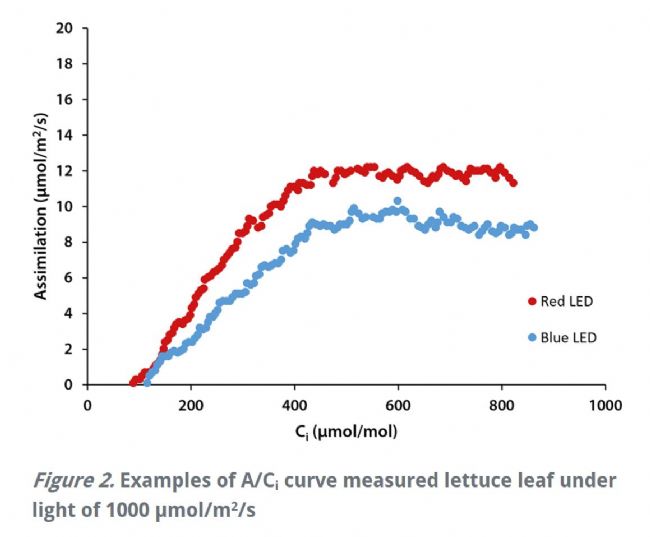 美國喬治亞大學園藝生理學實驗室使用CIRAS-3便攜式光合/熒光測定系統對生菜進行測定,在飽和光通量(1,000 undefinedmicro;mol/m2/s)的紅光和藍光下分別構建了A/Ci響應曲線。雖然生菜葉片對紅光和藍光的吸收能力不同,但使用飽和的PPFDs可以保證這種吸收能力的差異不會影響結果。