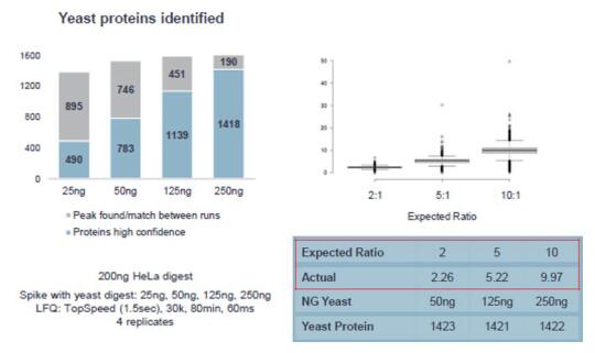 在Hela細(xì)胞樣品中摻入酵母樣品來考察非標(biāo)記定量的準(zhǔn)確性亦得到了非常優(yōu)良的結(jié)果,由于動(dòng)態(tài)范圍和譜圖質(zhì)量的提升,在非標(biāo)記定量的實(shí)驗(yàn)中“Match Between Runs”組件的效果得到了更加明顯的體現(xiàn)(圖2)。