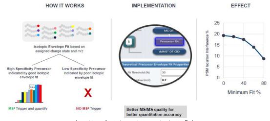 而對(duì)于共流出肽段干擾的問題,Exploris 480給出了兩個(gè)非常聰明的解決辦法。一是Precursor Fit的二級(jí)觸發(fā)選項(xiàng); 二是FAIMS Pro用于基于價(jià)態(tài)的肽段分級(jí)。Precursor Fit選項(xiàng)通過一級(jí)質(zhì)譜的數(shù)據(jù)計(jì)算目標(biāo)母離子在隔離窗口的含量,只有當(dāng)目標(biāo)母離子的含量超過閾值(一般為75%)時(shí)才會(huì)觸發(fā)二級(jí)(圖4)。這樣使得母離子會(huì)盡可能在其色譜洗脫峰的頂端來進(jìn)行二級(jí)質(zhì)譜的采集,一來縮短離子注入的時(shí)間,加快掃描速度,二來通過減少干擾來獲得更為準(zhǔn)確的定量數(shù)據(jù)。