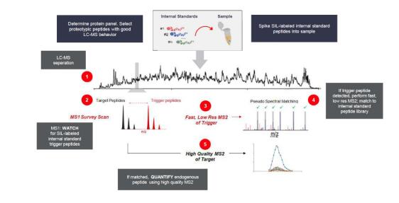 但是PRM一直受到通量問題的困擾,即使采用動態保留時間,也難以在一針采集中同時監控上百條肽段。因此,在2015年Gallien等人在MCP上發表了Internal-Standard triggered PRM(IS-PRM)的方法,其核心思想為對內標肽段進行一個低分辨,低離子注入時間的PRM掃描(內標的含量通常比較高,因此不會受到靈敏度影響),隨后在線對該PRM掃描進行實時譜圖檢索,若能夠匹配到目標序列則觸發對應內源肽段的高分辨,高離子注入時間的PRM掃描用于定量⁽⁴⁾。該方法由于需要使用賽默飛提供的API對儀器控制軟件進行編程修改,因此一直未能得到廣泛應用。
