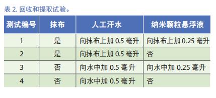 檢查抹布上回收和提取的納米微粒,進行四次測試,如表 2 所述。加入人工汗水和 / 或納米顆粒后,將樣本浸入 20 毫升去離子水中,并于冰浴中超聲 10 分鐘;然后立刻用 SP-ICP-MS 進行分析。這些測試均使用的是 30納米的銀納米顆粒(瑞典 Cline 提供)和 30-50 納米的氧化銅納米顆粒(德國 PlasmaChem 公司提供)