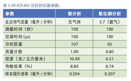 所有樣品分析均是使用 PerkinElmer NexION® ICP-MS 的單 顆 粒 模 式(SP-ICP-MS)下 進 行,并 結 合 使 用 了 Syngistix™納米應用軟件模塊進行數據分析和處理。使用的測試條件如表 3 所示。系統的傳輸效率按 60nm 的金納米顆粒計算,而樣品提升速率每天根據給定時間內提升水的質量差測定。