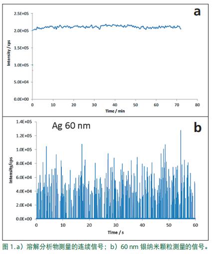 如需通過 ICP-MS 有效地檢測和測量單納米顆粒,則需以不同于溶解樣品分析時的方式操作儀器。溶解樣品和單納米顆粒分析的響應信號如圖 1 所示。在圖 1a 中,穩態信號來自于溶解元素的測量;檢測單顆粒時的信號呈現脈沖狀,如圖 1b 中 60 nm 銀顆粒檢測信號所示。在圖 1b 中,每個峰代表一個顆粒。數據采集方式的差異是理解單顆粒分析的關鍵,要理解這部分內容,最為簡單的方法就是分析與比較溶解態元素和顆粒測量時所涉及的流程。
