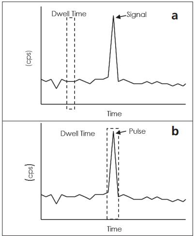 在測量溶解態元素時,氣溶膠進入等離子體,液滴得到去溶劑化與電離化。產生的離子進入四極桿,通過其質荷比(m/z)進行分辨。四極桿在各質荷比(m/z)停留一段時間,然后移動到下一質荷比(m/z);各質荷比(m/z)的分析時間被稱作“駐留時間”。在各駐留時間的測量完成之后,執行下一次測量之前,通過一定時間進行電子器件的穩定。該時間段被稱作“穩定時間”,即暫停和處理時間。在分析溶解態元素時,產生的信號基本上屬于穩態信號,如圖 2a 所示。然而,考慮到駐留時間和穩定時間,由于存在電子器件的穩定時間,因此檢測信號其實是不連續的,而這是納米顆粒分析時的一個關鍵點(圖 2b)。