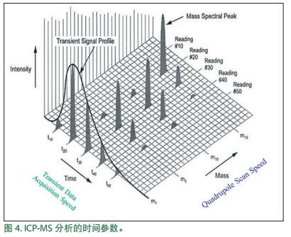 圖 4 顯示的是 ICP-MS 分析中涉及的時間參數。三個坐 標軸分別代表信號強度、質荷比(m/z)和時間。對于常規 / 溶解態分析,質荷比軸和信號強度軸的重要性最高:所得出的譜圖是 m/z 與信號強度的圖表。在考慮四極桿從質荷比到質荷比的移動速度時,時間軸具有重要意義,而此參數被稱為“四極桿掃描速度”。在測量瞬態信號的多個元素(如激光燒蝕和多元素形態分析)時,四極桿掃描速度具有重要作用。