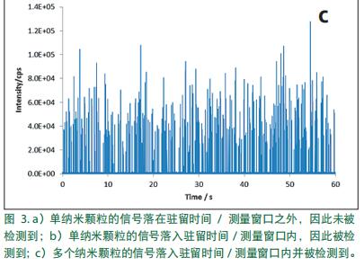 以相同于溶解態溶液的方式,將水溶液中的顆粒引入等離子體。當液滴在等離子體中去溶劑化時,產生的顆粒經過電離化產生大量離子(每個顆粒形成一個離子云)。隨后,離子進入四極桿。然而,使用傳統的 ICP-MS 數據收集方式,且在駐留時間和穩定時間之間交替時,無法始終檢測到離子云。例如,如果離子云恰好落在駐留時間窗口內,則可以被檢測到。否則,如果離子云在穩定時間內進入四極桿或到達檢測器,則無法被檢測到,從而導致計數不準確。如圖 3a 所示,如果單顆粒(“信號”峰)的離子云落在駐留時間窗口之外,則可能無法被檢測到。如圖 3b 所示,當單顆粒的離子云落入駐留時間窗口內時,可以檢測到該離子云。當快速連續檢測到多個顆粒時,所得到的信號是一系列峰,各個峰都來自于某一顆粒,具體如圖 3c 所示。