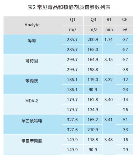 以下參數(shù)以PerkinElmer QSightTM 210 三重四極桿質(zhì)譜儀為例,目標(biāo)化合物質(zhì)譜參數(shù)見表2和表3.