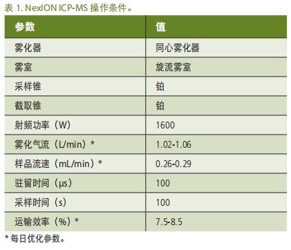使用配備有 Syngistix™納米應用軟件模塊的 PerkinElmer NexION® ICP-MS 進行樣品分析和數據處理。儀器和方法參數如表 1 和表 2 所示,更多詳情參見參考文獻 8,9。為避免48Ca 對48Ti 產生干擾,請選擇47Ti 進行分析。