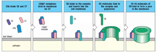 CDC作用則是利用了另一種手段,依賴一套復雜的免疫體系——補體。不過,復雜歸復雜,CDC作用可是利妥昔單抗殺傷腫瘤細胞的主要作用機理[2]:當補體蛋白C1q與利妥昔單抗結合后,就與細胞膜表面的相應抗原結合形成復合物,起始補體系統的經典途徑。接著C1q的八位兄弟C2-C9就像葫蘆娃一樣被招募而來,形成攻膜復合體(MAC),齊心協力把腫瘤細胞撕成碎片。該過程類似ADCC作用中的穿孔素的殺傷過程,最終導致腫瘤細胞凋亡。