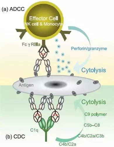 前者是指抗體的Fab段與感染或腫瘤細胞的抗原表位結合,Fc段與殺傷細胞(NK細胞、巨噬細胞等)表面的FcR結合,介導殺傷細胞直接殺傷靶細胞的作用。后者指的是補體通過特異性抗體與細胞膜表面相應抗原結合,激活補體經典途徑,形成的攻膜復合物裂解靶細胞的作用。