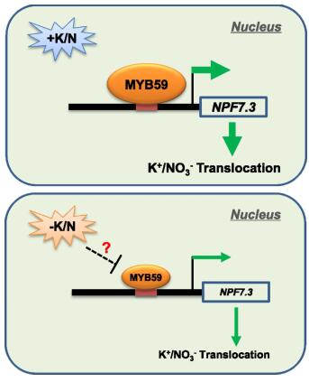 本論文研究結(jié)果表明,MYB59是NRT1.5的正向轉(zhuǎn)錄調(diào)節(jié)因子。在正常鉀條件下,MYB59促進(jìn)NRT1.5的轉(zhuǎn)錄,進(jìn)而促進(jìn)擬南芥中K+和NO3-從根向冠的協(xié)同運(yùn)輸過程。低鉀脅迫時(shí),MYB59的轉(zhuǎn)錄水平和蛋白水平均被下調(diào),結(jié)果使NRT1.5的轉(zhuǎn)錄被抑制,K+和NO3-從根向冠的協(xié)同轉(zhuǎn)運(yùn)也隨之受抑。論文研究工作證明了MYB59和NRT1.5這一轉(zhuǎn)錄調(diào)控通路在植物響應(yīng)環(huán)境鉀虧缺、調(diào)控鉀/氮協(xié)同轉(zhuǎn)運(yùn)及根冠分配方面有重要作用。