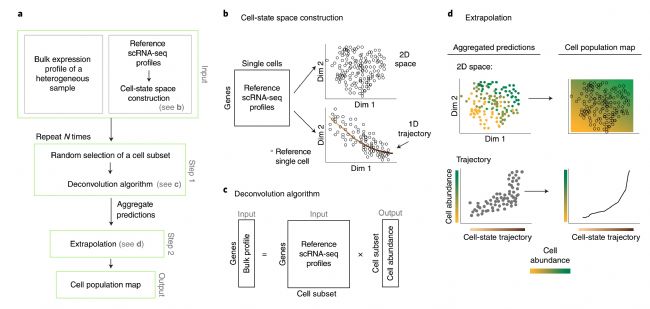 來自以色列特拉維夫大學的研究人員發表了“Cell composition analysis of bulk genomics using single-cell data”的研究。該研究引入了一種基于反卷積算法的細胞群體圖譜(CPM)工具,其利用參考scRNA-seq譜來推斷大量轉錄組數據('scBio'CRAN R-package)中細胞類型和狀態的組成。通過對流感病毒感染小鼠的肺個體差異的分析揭示,細胞豐度和臨床癥狀之間的關系是細胞狀態特異性的,其沿著細胞活化狀態的連續性逐漸變化。在隨后的實驗中證實了這種逐漸變化,并且通過數學模型進一步解釋了其中臨床結果與激活過程中的細胞狀態動態相關。該結果證明了CPM在重建異質組織內細胞狀態的連續譜中的能力。
