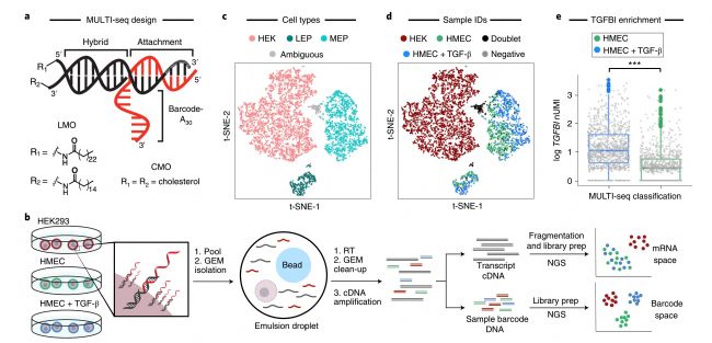 多樣本標記對于降低單細胞RNA測序成本和鑒定多細胞率等都非常重要。來自加州大學舊金山分校藥物化學系的研究人員發表“MULTI-seq: sample multiplexing for single-cell RNA sequencing using lipid-tagged indices”的研究。該研究建立了一種稱為MULTI-seq的方法:使用脂質標記indices進行單細胞和單核RNA測序的多樣本標記。MULTI-seq reagents可憑借易進入的質膜對來自任何物種的任何細胞類型或細胞核進行條形碼編碼。該方法涉及最少的樣品處理,從而保持細胞活力和內源基因表達模式。當使用MULTI-seq條形碼對不同樣本的細胞進行標記分類時,可通過雙重鑒定和具有低RNA含量的細胞回收來改善數據質量。