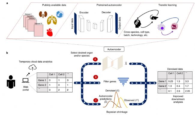 單細胞RNA測序(scRNA-seq)數據嘈雜且稀疏。為降低數據噪音,來自賓夕法尼亞大學統計系的研究人員發表題為“Data denoising with transfer learning in single-cell transcriptomics”的研究。在該研究中,研究人員表明跨數據集的轉換學習顯著提高了數據質量。通過將深度自動編碼器與貝葉斯模型耦合,SAVER-X方法從不同實驗室,不同條件和不同物種的數據中提取可轉移的基因-基因關系,以實現對新的目標數據集進行去噪。