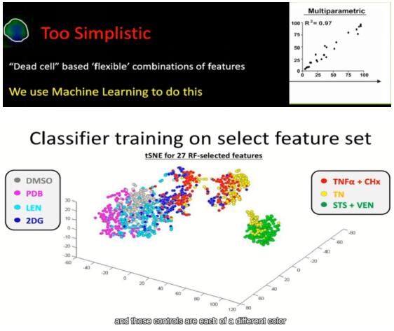 在單細胞解析中,David Andrews向我們強調了樣本的復雜性,需要利用機器自學習的優勢來深度挖掘藥物處理后的表型變化。利用對照藥物,研究通過多指標分析定義多種表型,并以此為基礎進行臨床抗腫瘤藥物的藥效預測。通過分析藥物處理后的PDC細胞表型,不僅能預測針對特定病人的藥物治療有效性,還能挖掘藥物對應的細胞表型,做到了細胞表型-藥物相互作用的深度分析。