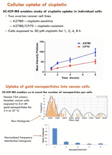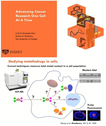 Elizabeth New博士則從金屬藥物和納米材料分析角度出發,展示了單細胞水平分析在腫瘤藥物研究中的應用前景,F階段,鉑類等金屬藥物已經成為化療治療中的一線用藥,并且是多種聯合用藥的基礎。要了解金屬藥物和細胞之間的相互作用,我們離不開分析細胞對金屬的攝取和積累,探究藥物和蛋白&DNA之間的相互作用,以及藥物處理對整個細胞穩態的影響。傳統的分析技術主要基于大量細胞的裂解液得出均一化的結果,因此受到金屬藥物代謝多樣性和腫瘤細胞異質性的挑戰。