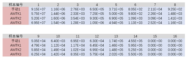 16個(gè)樣本分別人工和AMTK工作站進(jìn)行提取和QPCR體系構(gòu)建,其中工作站平行3次實(shí)驗(yàn),數(shù)據(jù)對(duì)比如下: