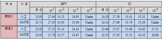2個(gè)樣本原液和梯度稀釋4次,分別人工和AMTK工作站進(jìn)行HPV提取,QPCR檢測(cè)結(jié)果如下: