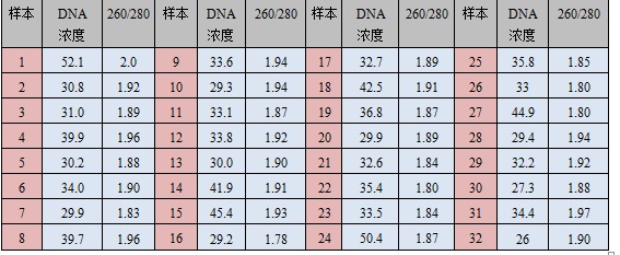 32個(gè)宮頸脫落細(xì)胞保存液原管上樣,AMTK LH-1808工作站進(jìn)行HPV核酸提取,提取后DNA的檢測(cè)結(jié)果如下: