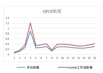 16個(gè)樣本分別人工和AMTK LH-1406工作站進(jìn)行核酸提取和文庫構(gòu)建,文庫QPCR定量結(jié)果如下: