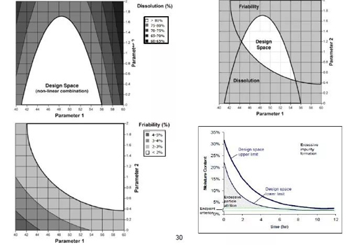 QbD(Quality by Design)的概念最早是在2004年由美國FDA提出的,并被納入到ICH質量體系當中成為指導原則和指南。QbD,即質量源于設計,是指藥物的質量控制應該從最早期的研發設計環節做起。與之前的QbT(Quality by Test), QbP(Quality by Product)相比,進一步向前推進了質量控制包括的環節,為整個過程可以更加充分、科學的研究和開展奠定基礎,使新開發的藥物能夠更加順利的通過檢驗。設計空間(Design Space)是一個與之相伴隨的概念,指的是藥品質量(如溶解度等)與多個生產條件要素參數之間的多維度函數,在此函數中符合藥品質量要求的區域被稱為設計空間,其意義在于之后的研發和生產操作都應在此空間之內,一旦超出則視為變更,需要重新評估調控。