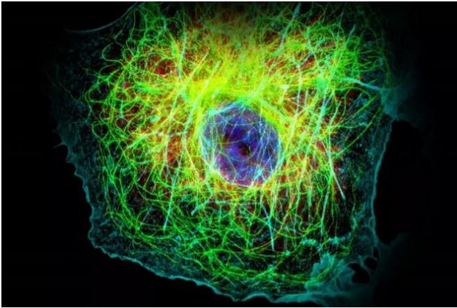 STED:Alexa 647-波形蛋白 (紅色)、Alexa 594 -α 微管蛋白 (綠色)、Alexa 488-微絲 (青綠色)。共聚焦:DAPI-DNA (藍色)。致謝:Eugene Katrukha,荷蘭烏特勒支大學