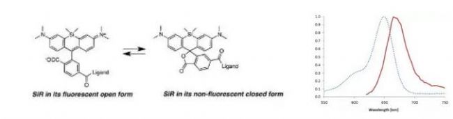 眾所周知,超高分辨率成像技術 (包括 STED) 都需要將目標結構標記上熒光比較強且光穩定性好的染料,特別是活細胞超高分辨率成像就更是如此。傳統的活細胞成像方法主要是通過在細胞中轉染熒光蛋白而實現。相比之下,有機染料比熒光蛋白更有優勢,因為它們能產生比熒光蛋白高幾個數量級的光子,從而在成像時能達到更好的分辨率。但是,能和 STED 成像匹配的活細胞有機染料并不多,因為大多數的有機染料都不能透過細胞膜和活細胞內的結構特異性結合。