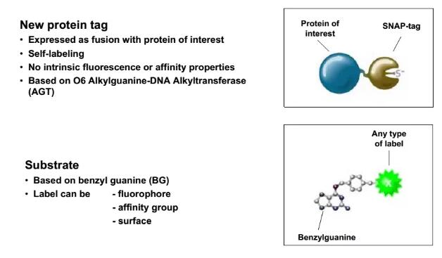 SNAP-TAG 是一種經過改造后的DNA修復酶,可以特異性和它的底物BG (benzyl guanine芐基鳥嘌呤) 結合,如果將這種DNA修復酶的基因和目標蛋白的基因融合并轉到細胞內,那么在細胞內加入標記了熒光的底物就可以看到細胞內目標蛋白的熒光。HALO-TAG也是類似的原理,只不過HALO-TAG的底物是CA (chloroalkane 氯烷烴)。
