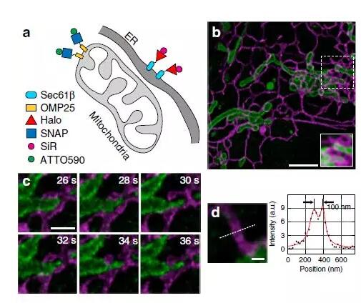 研究者們通過這種標記工具SNAP-TAG -SiR和HALO-TAG-ATTO590分別標記活細胞中的線粒體和內質網,并使用超高分辨顯微鏡(STED)觀察了這兩種細胞器中不同蛋白的相互關系和動態變化(如下圖4),2秒/張的頻率拍攝100張圖片后,熒光亮度仍然保持不變。可以觀察到線粒體和內質網融合的整個過程,如視頻1和視頻2。