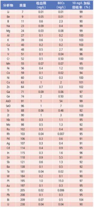 20% HCl 中各元素的檢出限、背景等效濃度、10 ng/L 的加標回收率