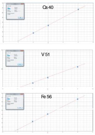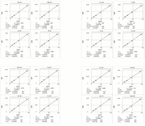 GDI-ICP-MS法繪制的校準曲線(標準氣體產生方式:在氬氣中霧化標準溶液,這些標氣對所有待測元素的線性都在0.9999以上)