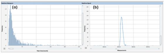 TMAH 中含鐵納米顆粒結果圖譜:(a)粒徑分布;(b)單個含鐵納米顆粒實時信號