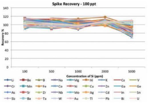 基質耐受性:Si 基質濃度為100ppm 到5000ppm 樣品100ppt 加標回收