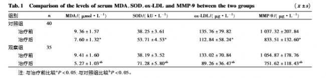 結果:治療前 2 組患者血清 MDA、 SOD、ox-LDL、MMP-9、NSE 及 BDNF 水平比較差異無統計學意義( P > 0. 05) ; 與治療前比較,治療后 2 組患者血清 MDA、ox-LDL、MMP-9 及 NSE 水平顯著降低,SOD 和 BDNF 水平顯著升高( P <0. 05) ; 治療后,觀察組患者血清 MDA、 ox-LDL、MMP-9 及 NSE 水平顯著低于對照組,SOD 和 BDNF 水平顯著高于對照組( P < 0. 05) 。治療前 2 組患者 NIHSS、ADL 評分比較差異均無統計學意義( P >0. 05) ;與治療前比較,治療后2 組患者 NIHSS 評分顯著降低,ADL 評 分顯著升高( P <0. 05) ;治療后,觀察組患者 NIHSS 評分顯著低于對照組,ADL 評分顯著高于對照組( P < 0. 05) 。觀 察組和對照組患者治療總有效率分別為 91. 43% ( 32/35) 、72. 50% ( 29/40) ,觀察組患者總有效率高于對照組( χ2 = 11. 362, P <0. 05) 。