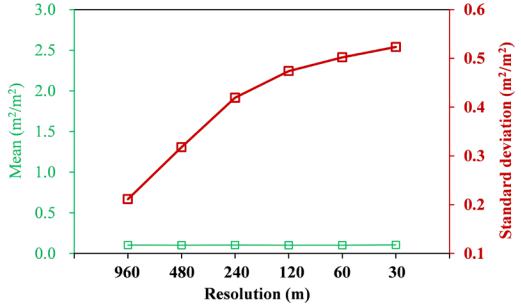 過程,構建了復雜山地多尺度 LAI 遙感反演模型,生成 了 960m 、480m 、240m 、 120m 、60m 和 30m 尺度 LAI