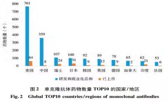 1986 年 FDA 批準了第一個治療性單抗藥物,單抗藥物從靶點發(fā)現到人源化抗體技術改進, 從臨床研究的不斷推進到商業(yè)化策略的不斷完善,各方面均日趨成熟,已然占領了醫(yī)藥領域市場的半壁江山。全球單抗藥物市場規(guī)模約千億美元,近10年的增長速度仍保持 10% 以上,高于其他醫(yī)藥行業(yè) 5% ~ 6%的增速水平。眾所周知,美國無論研發(fā)水平或市場份額,均為全球單抗藥物研發(fā)最大的基地,近年來,隨著中國醫(yī)藥市場及政策的日趨成熟,中國成為僅次于美國的第二大單抗藥物市場。數據來自科睿唯安( Clarivate Analytics, 原湯森路透知識產權與科技事業(yè)部) 的 Cortellis 數據庫作為檢索對象 (圖1,2)截止2018年10月[1]。