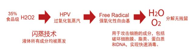 通過氣化過氧化氫產生氧游離基,作用于物體表面與環境中的微生物,作用于微生物內外部組織,起到滅菌作用。