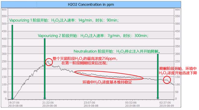 圖7.整個滅菌周期環境中H2O2氣體濃度變化曲線