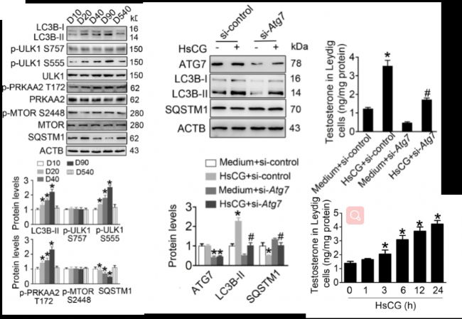 本研究中作者檢測了LCs自噬標記物LC3B-II,發現LCs中LC3B-II在細胞分化過程中表達增加,并且在成年人LCs中達到峰值。此外LC3B-II在LCs從莖細胞向成體細胞分化過程中表達量增加,同時血清睪酮水平逐漸升高。進一步研究發現沉默ATG7后抑制HsCG誘導LC3B-II表達和睪酮分泌,表明LCs自噬介導睪酮合成。