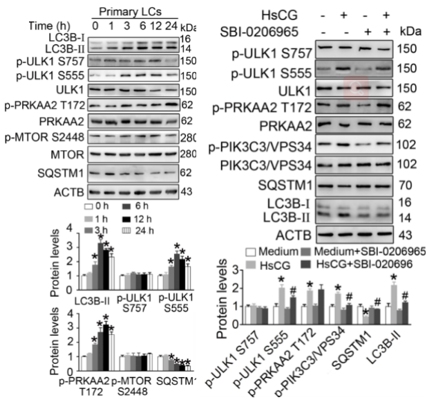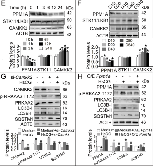為了探究在LCs中HsCG誘導p-PRKAA2 Thr172 增強表達的機制,作者檢測了兩種經典的磷酸化激酶CAMKK2和STK11/LKB1以及去磷酸化酶PPM1A,數據顯示HsCG可以誘導的CAMKK2表達增加和PPM1A的表達減少,此外,TM3細胞和初級LCs在CAMKK2敲低或者過表達PPM1A后,明顯抑制了HsCG誘導增加LC3B-II的表達、AMPK活化和降低SQSTM1的表達。