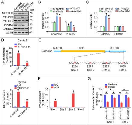 RIP(云序生物提供此服務)實驗分析發現Cammkk2與YTHDF2(Reader)緊密結合,這也證實了m6A修飾降低Camkk2的轉錄表達。