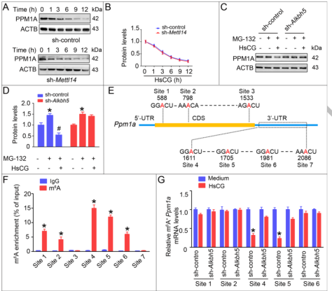 作者觀察到YTHDF1(Reader)或METTL14敲除后LCs中PPM1A的表達降低,但是Ppm1a mRNA的水平沒有明顯變化,有可能是蛋白穩定性或者翻譯效率導致Ppm1a蛋白表達下降。利用蛋白翻譯抑制劑CHX處理LCs,觀察METTL14敲除與未敲除后PPM1A在LCs中的降解速率,實驗結果表明HsCG降低了Ppm1a的表達,而敲除ALKBH5卻沒有;并且
