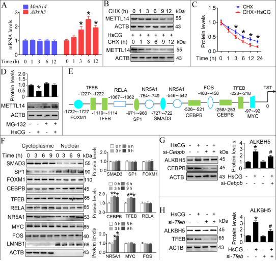 研究發現HsCG通過誘導METTL14降解降低其表達,并且通過提高ALKBH5轉錄水平增加ALKBH5的表達,而