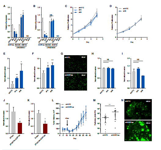 為了探索環狀CDR1as在黑色素瘤中的功能,作者沉默環狀CDR1as后檢測黑色素瘤細胞的表型。結果顯示在高表達CDR1as的黑色素瘤細胞(WM278和WM115)中干擾CDR1as并不能顯著影響細胞增殖,但可以顯著提高細胞侵襲能力。在低表達LINC00632/CDR1as的細胞(SK-MEL-28 和 501MEL)中,干擾CDR1as對侵襲表型沒有影響。在SK-MEL-28 和 501MEL細胞中過表達CDR1as能降低侵襲性,體內成瘤實驗也表明,干擾CDR1as并不顯著改變腫瘤大小和生長速度,但可以顯著提高肺轉移比例。