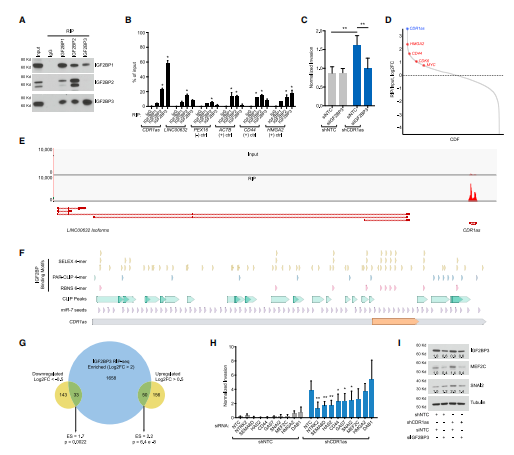 為揭示CDR1as在黑色素瘤中的作用機制,作者首先思考了CDR1as可能的相互作用蛋白。作者首先從CLIP-seq的在線數據中分析了可能的結合蛋白,并從中發現了IGF2BP家族蛋白存在與CDR1as相互作用的證據。為進一步驗證,作者進行了