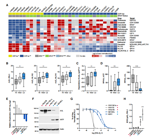 最后,為分析CDR1as表達狀態與黑色素瘤中藥物敏感性和基因型的相關性,作者對不同數據庫進行挖掘,并根據CDR1as表達狀態進行了分組,分別為高、中和低表達三組。作者發現低表達CDR1as 組的細胞對多種MAPK通路的抑制劑更敏感,而CDR1as高表達組中對BRAF抑制劑的不敏感性。同樣,高表達CDR1as組的細胞也對GPX4抑制劑更敏感。數據庫分析表明,黑色素瘤中GPX4抑制劑的敏感性與MITF / AXL基因的表達情況有關。作者分析發現CDR1as高表達的細胞傾向于表現出MITF低表達和AXL高表達,而CDR1as低表達的細胞傾向于表現出MITF高表達和AXL低表達。實驗結果也表明CDR1as表達狀態與GPX4抑制劑敏感性相關,低表達CDR1as組的細胞對GPX4抑制劑更敏感。然而在高表達CDR1as的細胞中干擾CDR1as后并不能提高對GPX4的敏感性,說明CDR1as可作為黑色素瘤對GPX4抑制劑敏感性的指標,但并非該藥物發揮功能的關鍵因素。