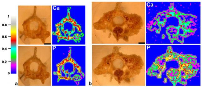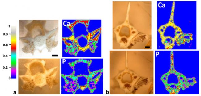 下圖為化石樣品組:健康蛇脊椎骨切面(a)和骨炎蛇脊椎骨切面(b)的Ca和P元素分布成像圖。(黑色橫條長度為1mm)