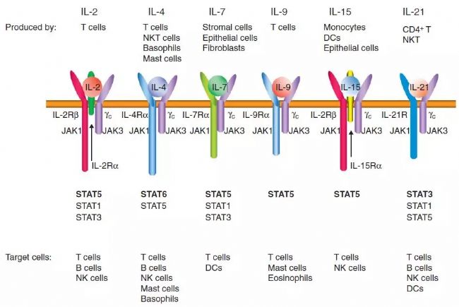 俗話說,不是一家人,不進一家門。IL-2家族的其他成員們在此后逐漸被研究發現,它們與IL-2有著極其相似的特征。成員IL-4、IL-7、IL-9、IL-15和IL-21,都是球狀蛋白,含有兩組短鏈α螺旋,都在促進和維持T淋巴細胞群中發揮重要作用,它們的細胞表面受體復合物都是由2-3個受體亞基構成,除了各自擁有的特異性受體亞基外,共享γC這個必需的共同受體亞基。γC亞基由IL2RG基因編碼,可以特異性的招募Janus激酶-JAK3,它的突變與X連鎖的重度聯合免疫缺陷(SCID)相關。IL-2家族的細胞因子均采用JAK3的細胞內信號轉導機制[1-2]。
