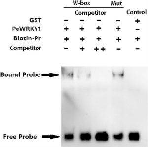 圖3. 使用凝膠阻滯技術(shù)(Electrophoretic Mobility Shift Assay, EMSA)驗(yàn)證PeWRKY1與
