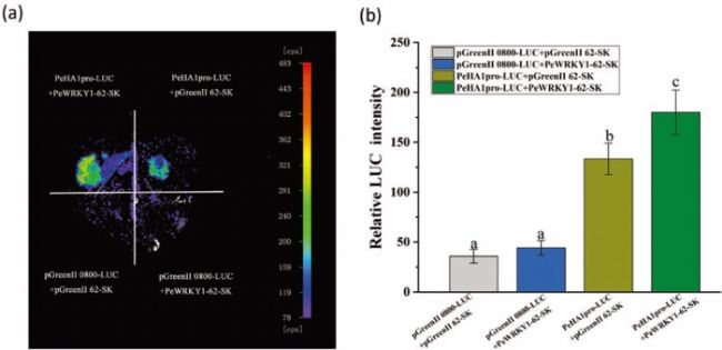 圖4. 使用熒光素酶檢測(cè)系統(tǒng)驗(yàn)證PeWRKY1與